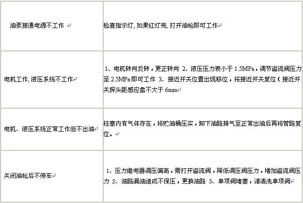 4、出油量可調(diào),將兩接近開關距離加大,延長換向時間,出油量減小,反之出油量增大。出油壓力可調(diào),將液壓溢流閥減小,出油壓力同時減小,正常情況下液壓表在2。5MPa為宜。出油壓力正常調(diào)在30MPa停止工作,如需調(diào)整時將壓力繼電器調(diào)壓閥增大或減小。